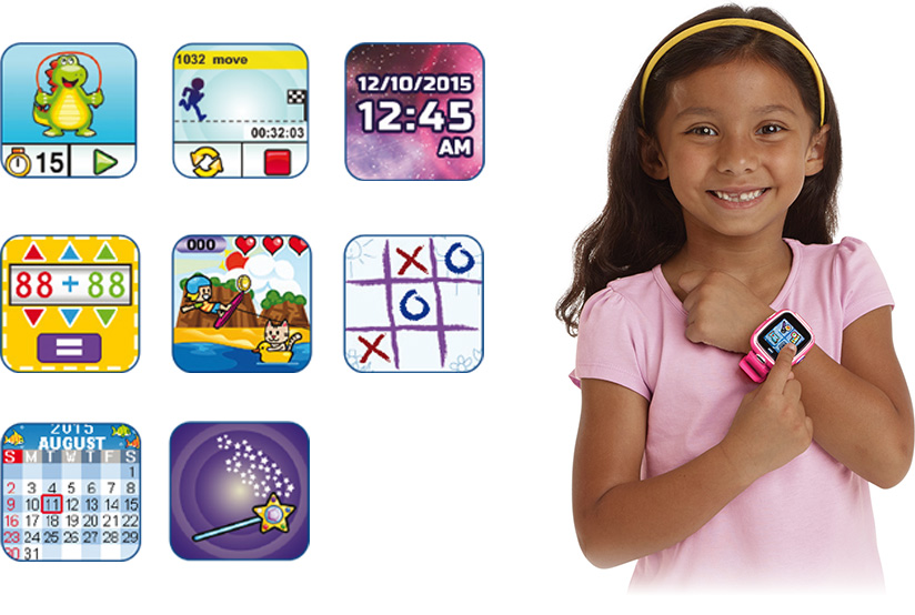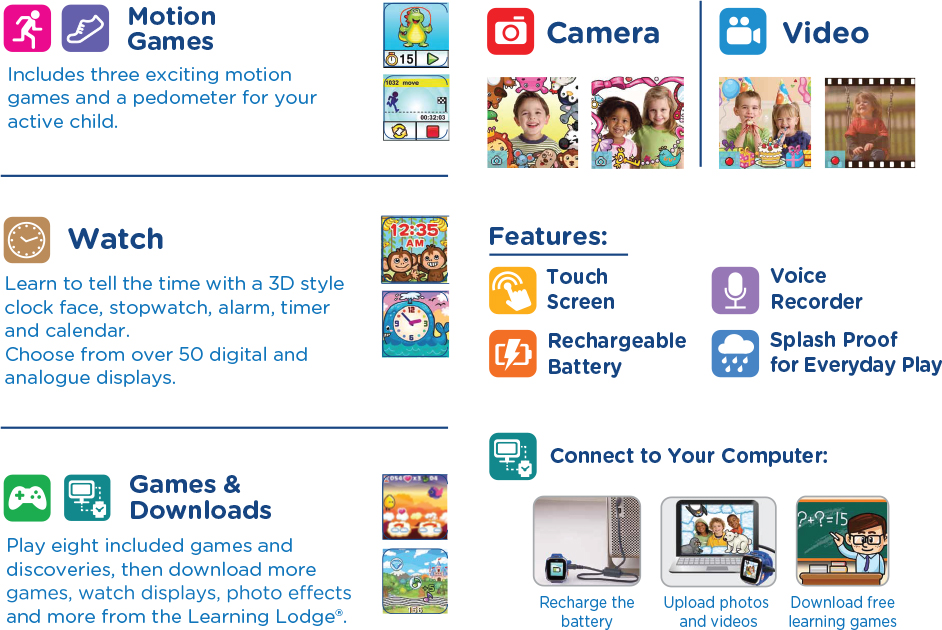 The next gen smart watch for kids! Smart watch for kids featuring photo and video taking, digital and analogue watch faces, 8 games, motion sensor, calculator, alarm, stop watch, voice recorder and more!