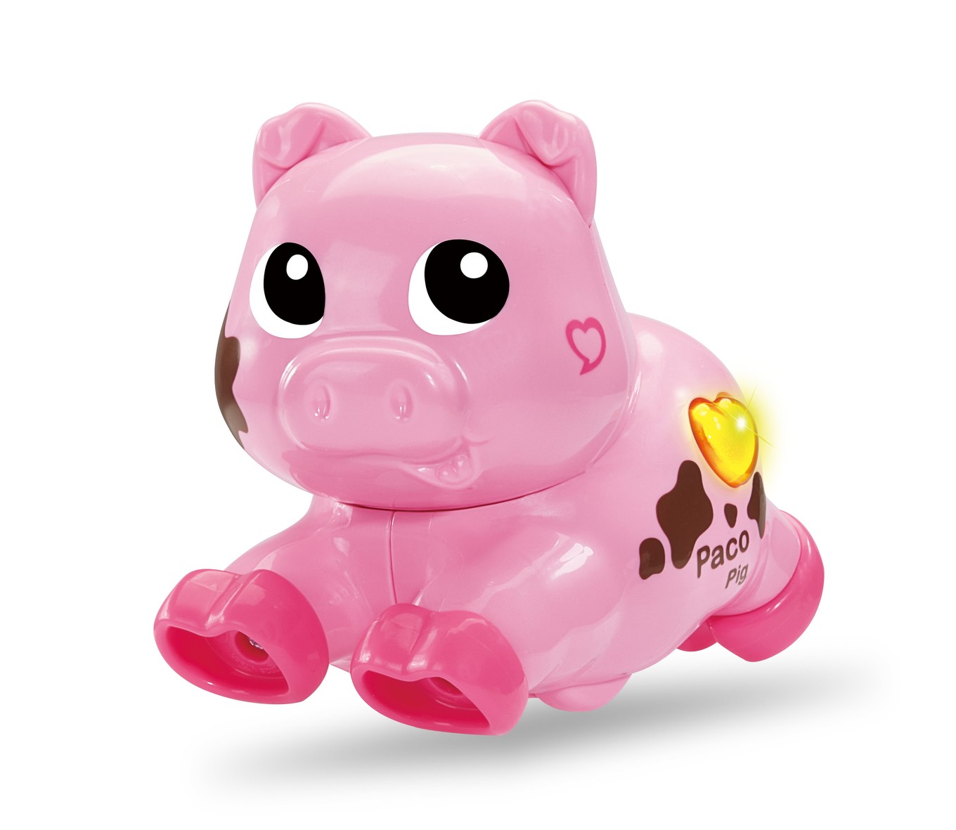 Hello, I'm Paco. I'm a smart pig! Press my light up heart button to trigger fun music, sounds and songs. Push me along for more reactions or press my cheek to hear me oink and kiss!