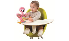 Adorable flamingo toy with lights, music, textures, and movement. Encourages sensory exploration, fine motor skills, and playtime fun with a secure highchair suction base.