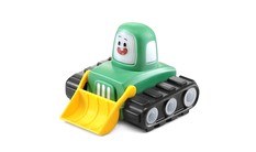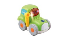 I’m a tough tractor! Light up face button triggers fun music, realistic sound effects and songs. Push along or press the button for more reactions.
