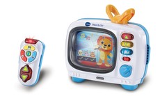 TV toy with flip-panel screen and magic remote control. 3 learning categories introduce multiple topics through fun phrases and songs. Change channels with the remote or TV buttons.